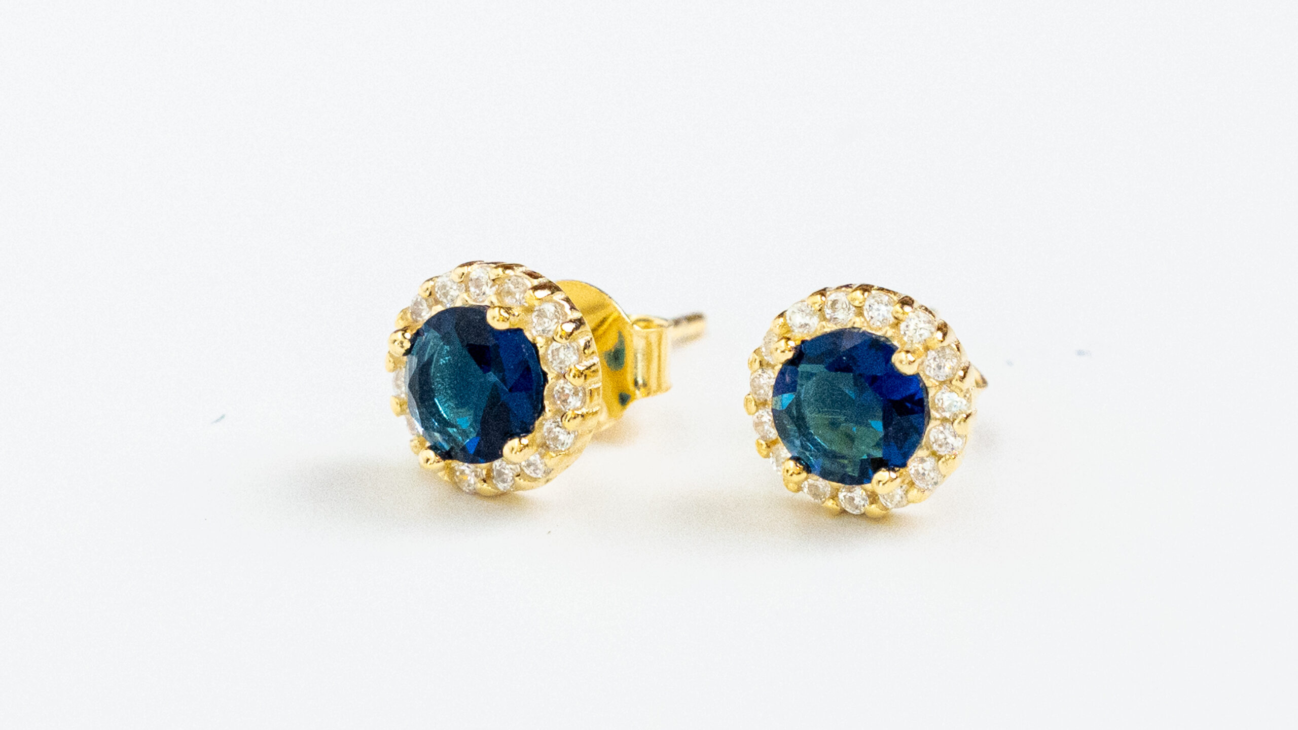 Silver 925 Goldplated Sapphire Halo Studs Sapphire center stone with clear gem halo.