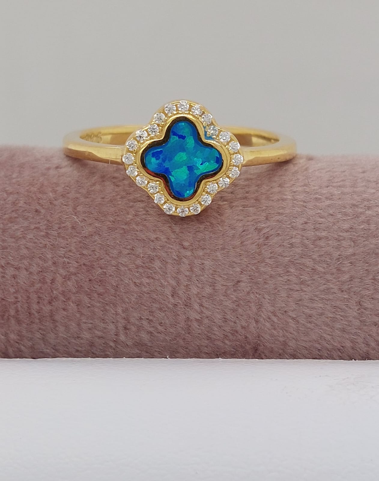 Silver 925 Goldplated with 18K ring with clover-like blue centerpiece – Surrounded by small white zircons