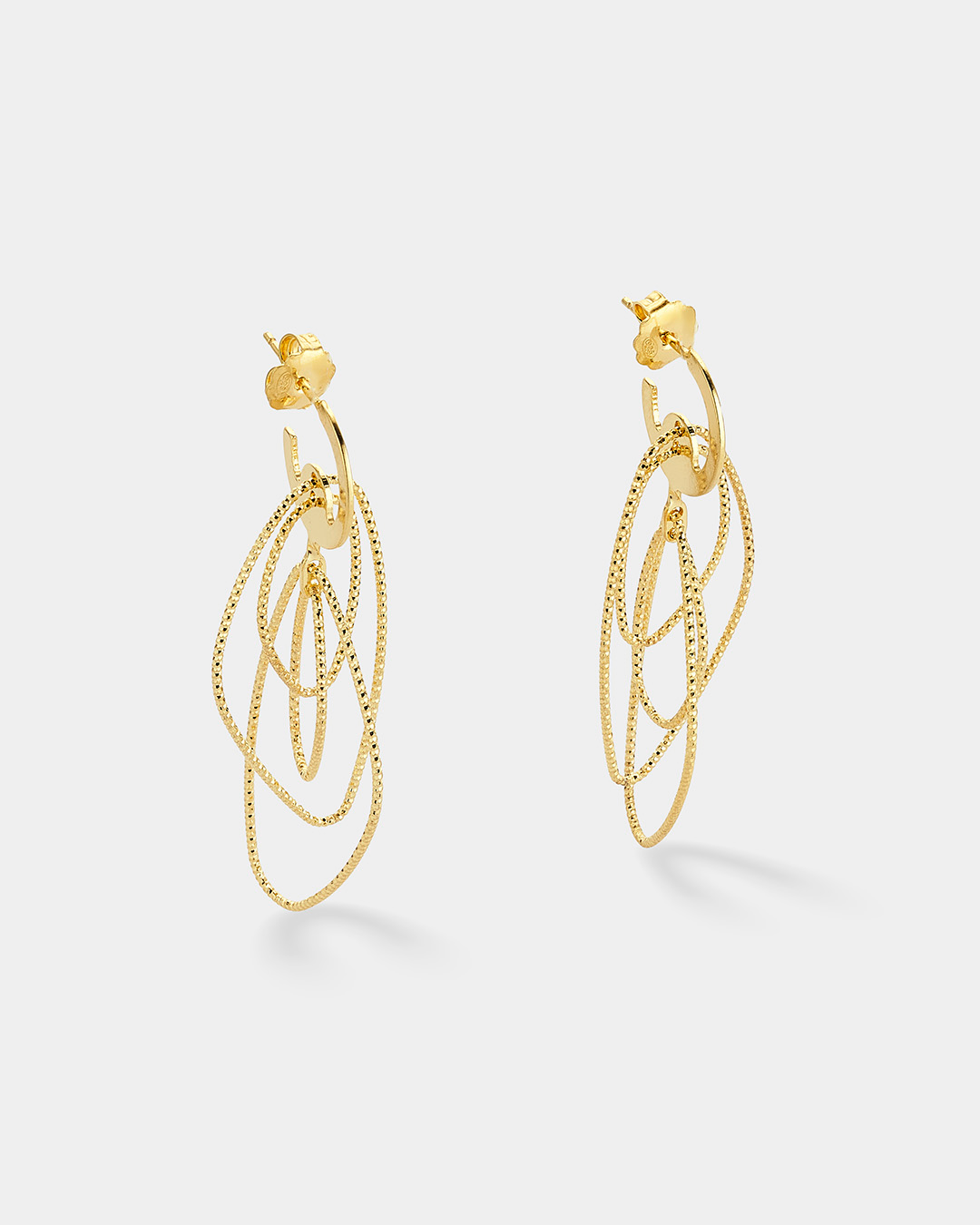 Discover earrings that embody the spirit of movement and light. Fine hoops intricately linked together, forming an ethereal design, dancing with your every movement. The light filters through the joined hoops, casting a play of shadows and gleams, VOGUE.